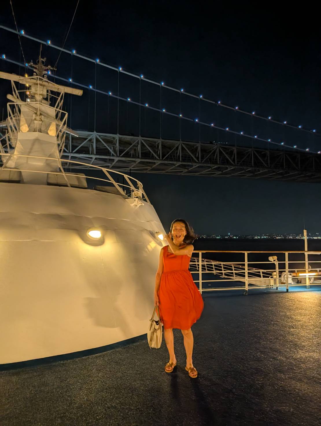 夜風を感じながら見上げた明石海峡大橋。